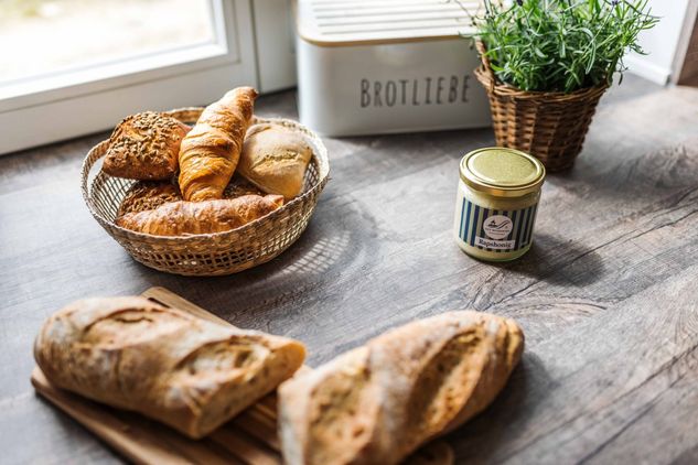Die Backwaren (Brötchen, süße Teilchen oder Brot) kommen von der Klosterbäckerei aus Flensburg, wo noch mit Herz und Liebe gebacken wird.