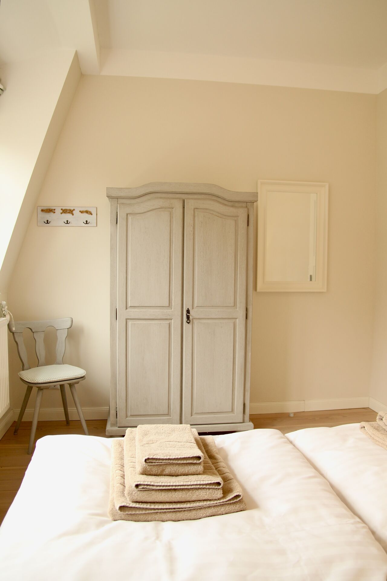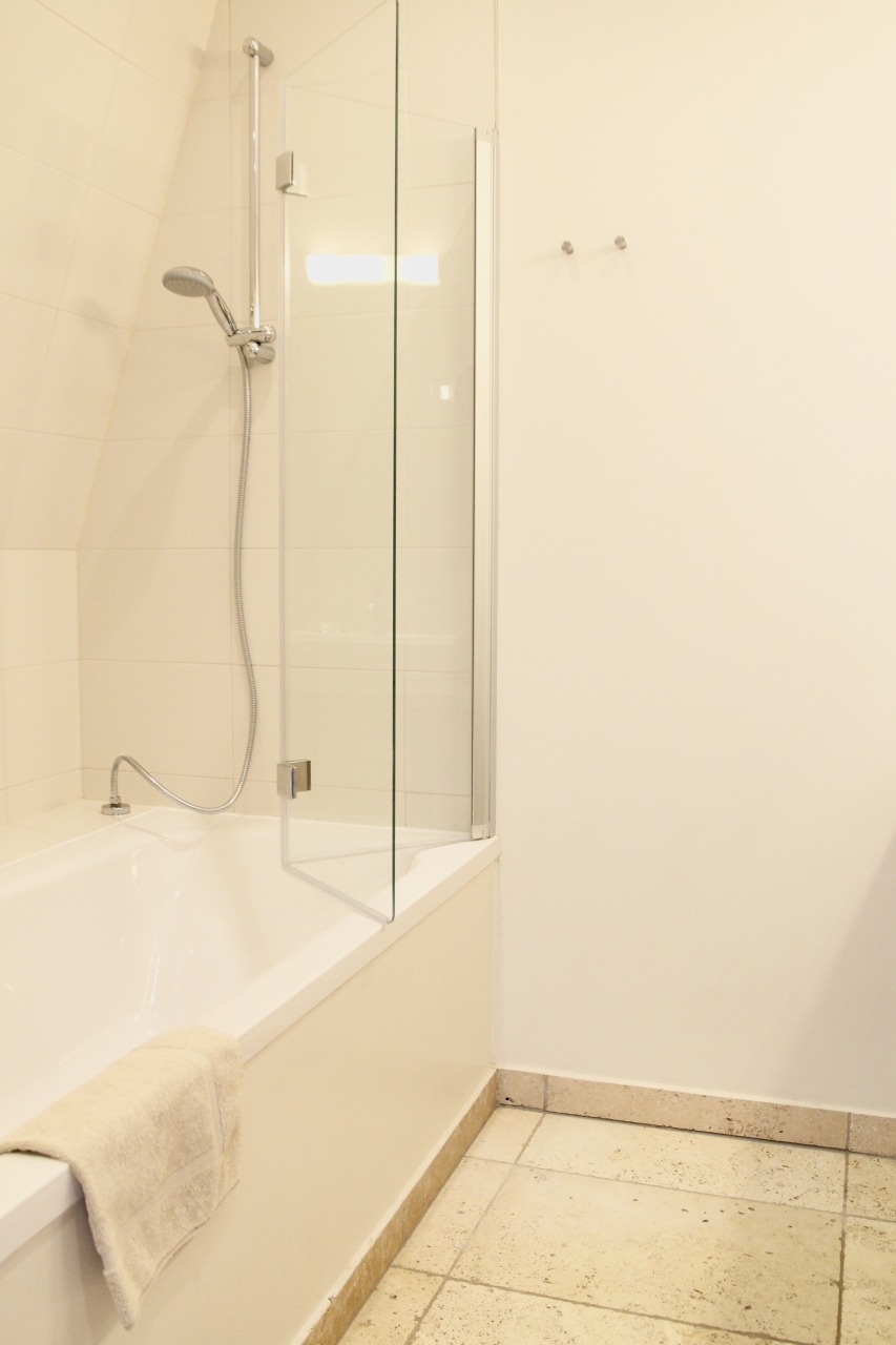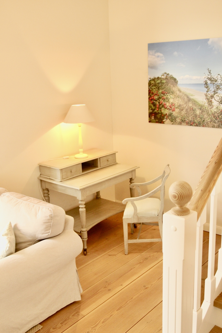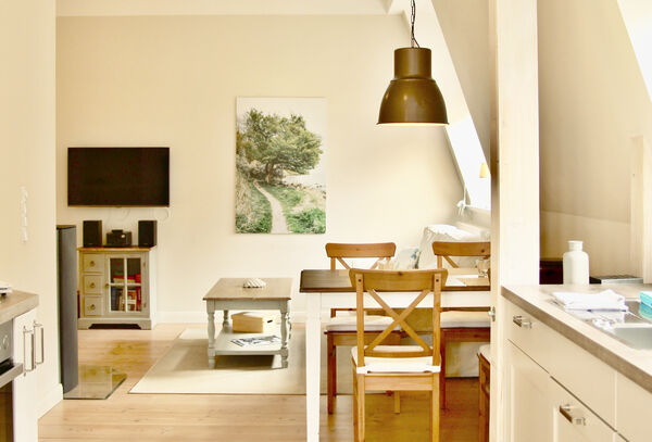 Die Wohnung ist ca 120 qm groß und eignet sich für 4 - 6 Personen. Sie verfügt über drei Schlafzimmer (2 Zimmer mit Doppelbett und 1 Zimmer mit 2 Einzelbetten) und zwei Bäder im Obergeschoss. Der Master-Bedroom hat ein eignes Bad mit Badewanne. Im Untergeschoss befindet sich ein großzügiger Wohnbereich mit Kaminofen. Von der offenen Küche mit großräumigem Essbereich hat man direkten Zugang zu den beiden Terrassen und einer Rasenfläche. Eine der Terrassen schwebt über dem Burggraben und hat Schleiblick. Im Eingangsbereich ist ein separates Gäste-WC untergebracht.