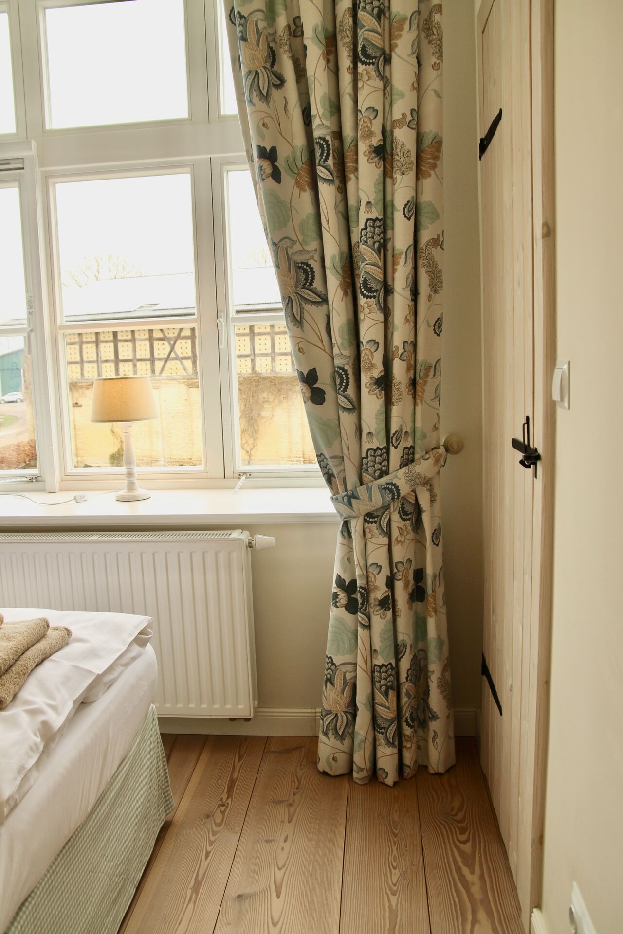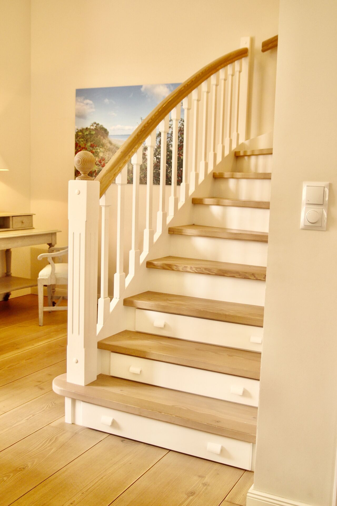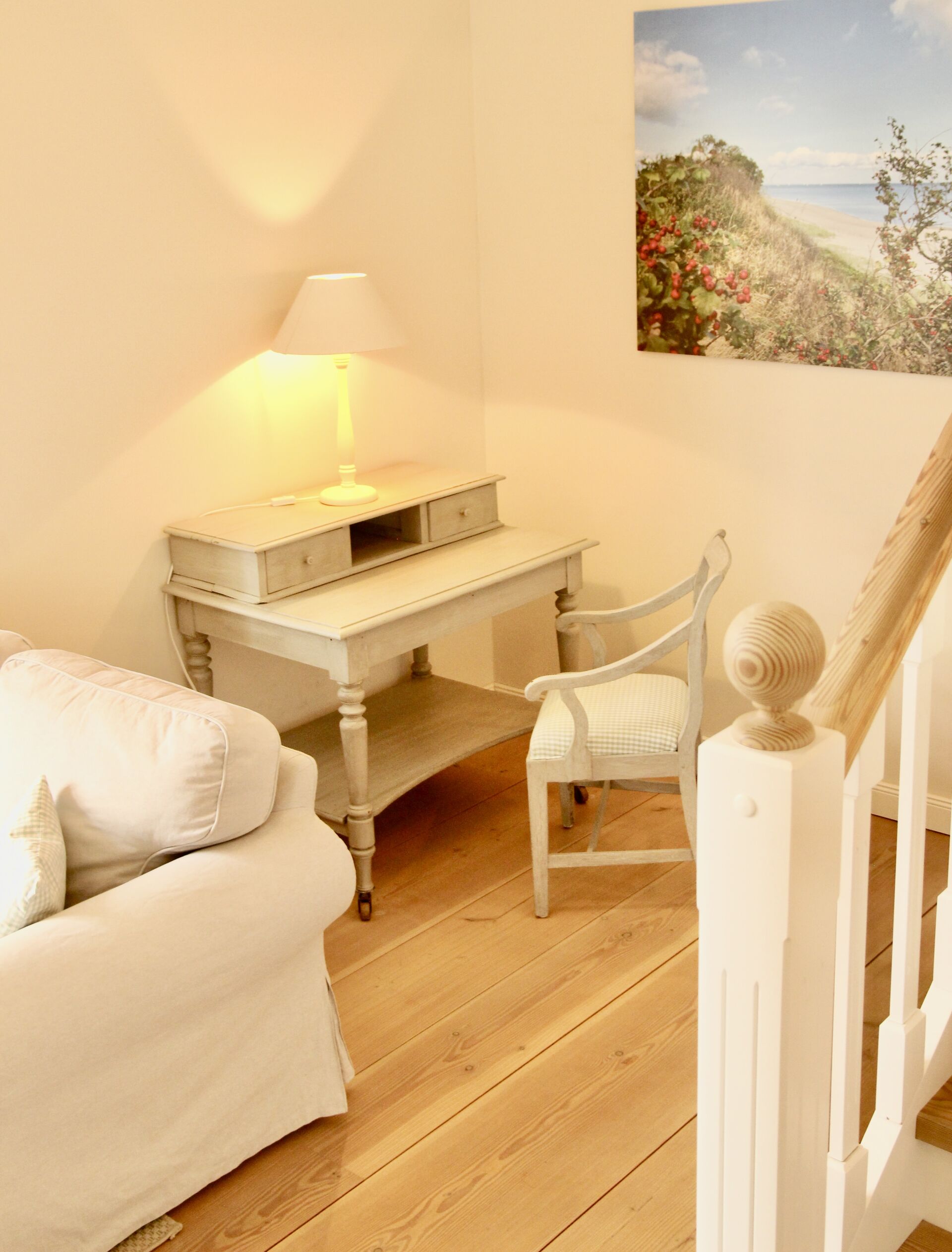 Die Wohnung ist ca 120 qm groß und eignet sich für 4 - 6 Personen. Sie verfügt über drei Schlafzimmer (2 Zimmer mit Doppelbett und 1 Zimmer mit 2 Einzelbetten) und zwei Bäder im Obergeschoss. Der Master-Bedroom hat ein eignes Bad mit Badewanne. Im Untergeschoss befindet sich ein großzügiger Wohnbereich mit Kaminofen. Von der offenen Küche mit großräumigem Essbereich hat man direkten Zugang zu den beiden Terrassen und einer Rasenfläche. Eine der Terrassen schwebt über dem Burggraben und hat Schleiblick. Im Eingangsbereich ist ein separates Gäste-WC untergebracht.