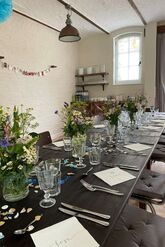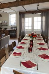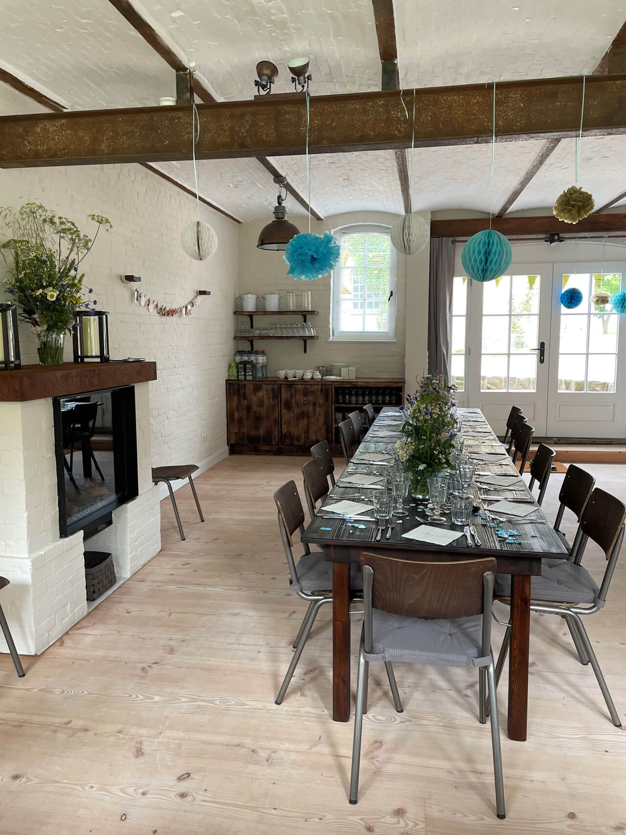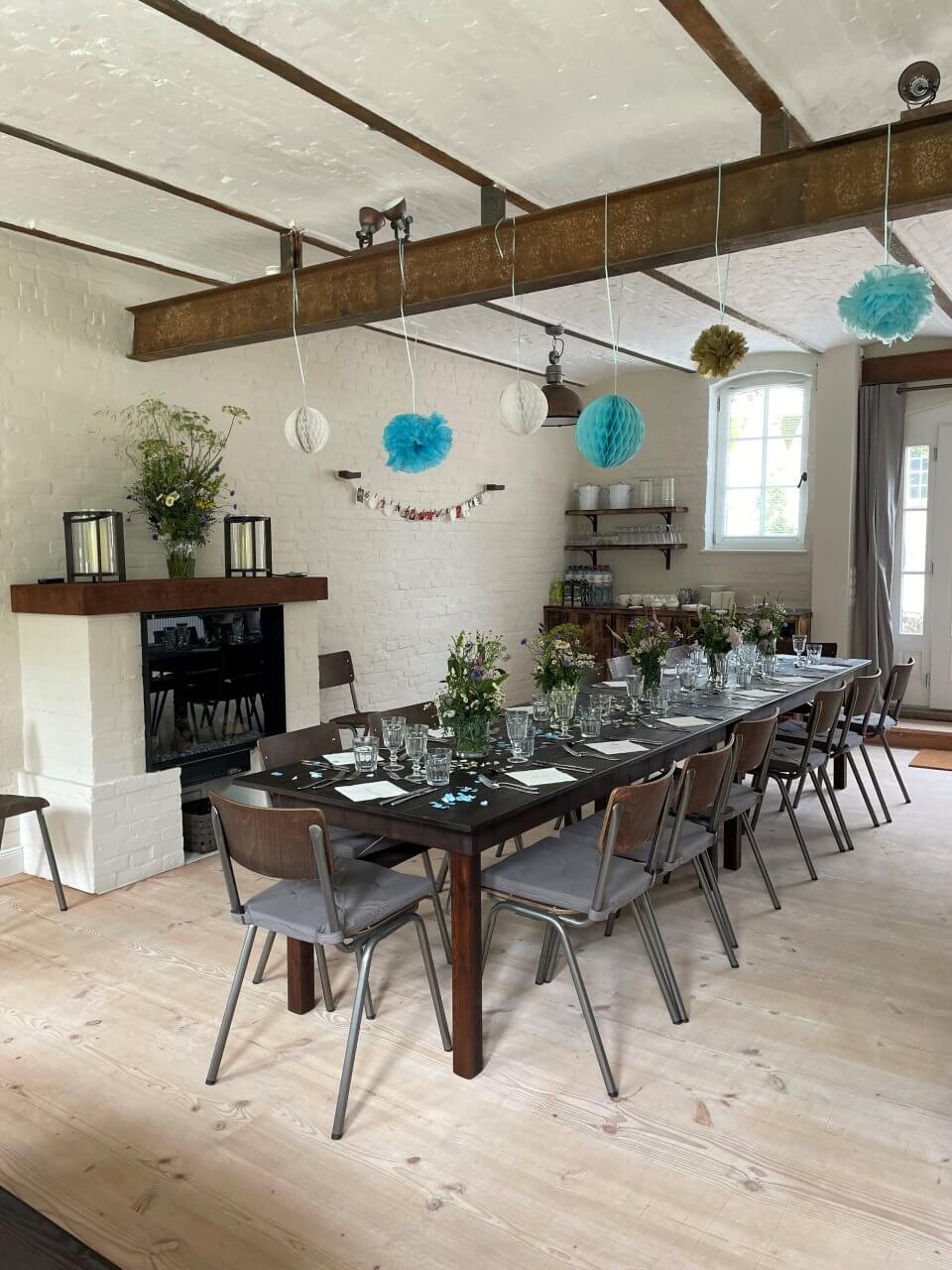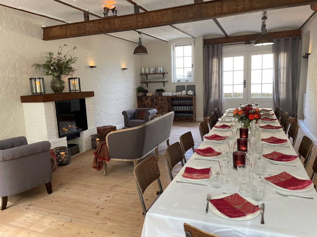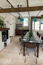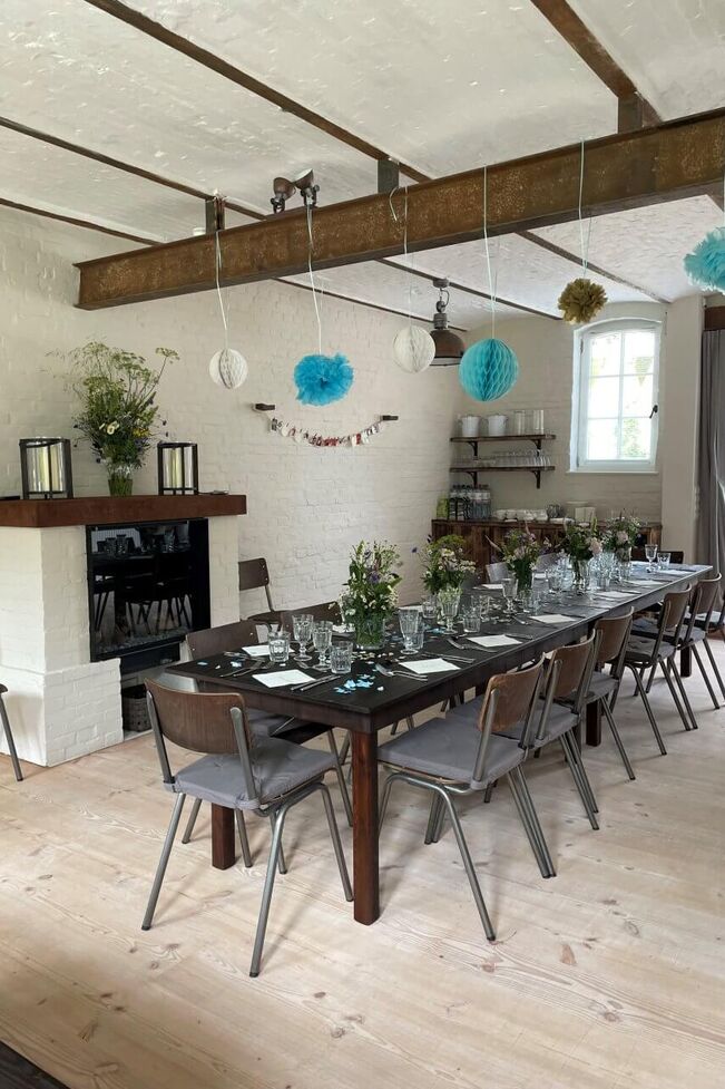 Auf Gut Buckhagen können unsere Gäste auch das Refugium buchen: ein großer gemütlichen Raum, der einst ein Kutschstall war. Das Refugium verfügt über eine schöne Gewölbedecke, Holzfußboden und Kamin. Vorm Kamin kann man es sich in einer Sitzecke mit Sofa und Sesseln gemütlich machen. Die angrenzende Küche ist sehr gut ausgestattet, ob zum Selber-Kochen oder für Caterer. Außerdem gibt es zwei angrenzende Toiletten. Je nach Aufstellung der Tische finden zum gesetzten Essen bis zu 24 Personen Platz, bei Buffett auch einige mehr.
