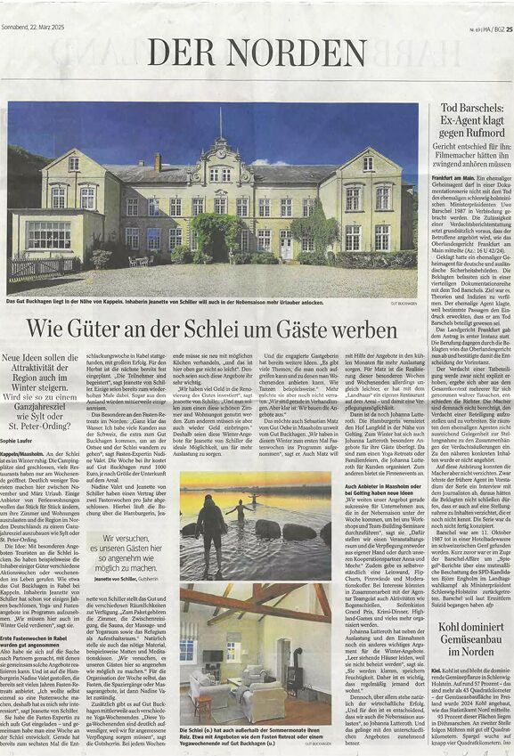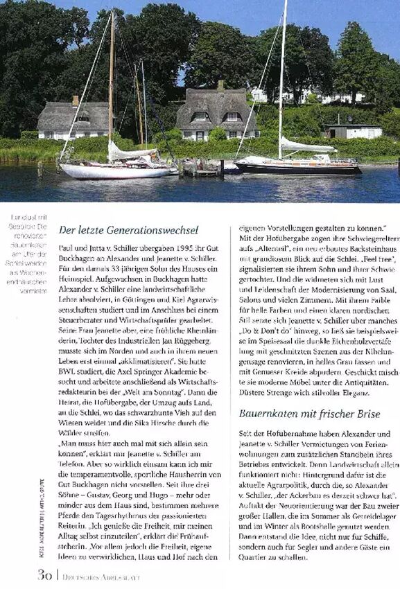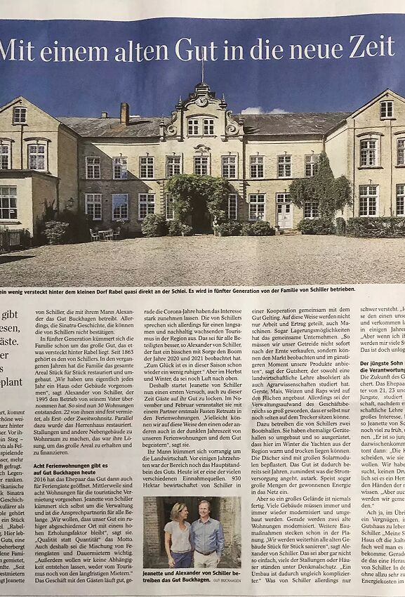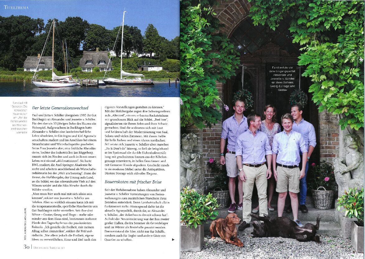 Auch im Leben der Familien von Schiller spielen Touristen eine große Rolle. Sie blicken auf eine lange Tradition in der Region zurück. Auf Gut Buckhagen, dessen Grundmauern bis ins Jahr 1231 zurückreichen, heißen Alexander und Jeanette von Schiller seit einigen Jahren Touristen willkommen, die von der historischen Idylle des alten Gutes aus die Region erkunden können.